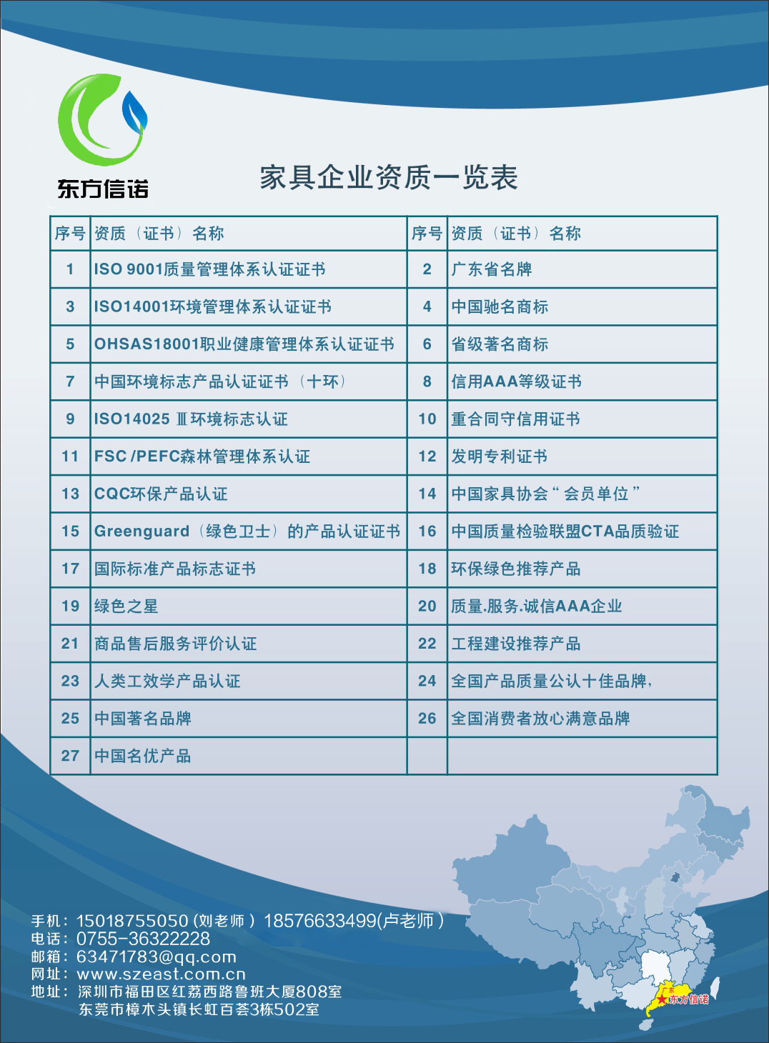 而每年深圳市東方信諾也會派人去家具展參觀這些家具。希望在深圳的家具展上看到我們的同事,可以了解一下我們辦的證書,以提升家具環(huán)保的需求。
