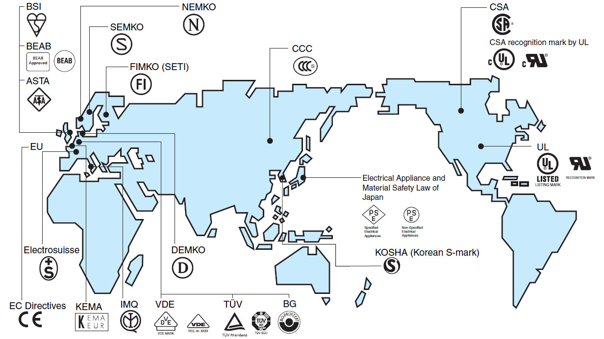 中國的3C認(rèn)證,其實(shí)和歐洲的CE認(rèn)證,北美的UL認(rèn)證,CSA認(rèn)證等等類似,下圖是一張全球不同國家強(qiáng)制認(rèn)證及其代表性標(biāo)識的分布圖。